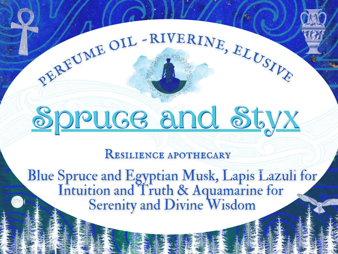 Spruce and Styx ~ Blue Spruce calls forth the northern forest, its crisp resin clearing away illusions and opening pathways to truth. Egyptian Musk, sacred scent of pharaohs and temples, carries the mysteries of death and rebirth across the threshold between worlds. Lapis Lazuli, stone of the gods, awakens inner sight and connects us to divine truth that transcends the physical realm. Aquamarine flows like the waters of the River Styx itself, offering courage for the soul's journey through transformation and the serenity that comes from surrendering to life's mysteries and the ferryman himself. This blend guides us through our own underworld passages, emerging with deeper wisdom and renewed spirit.